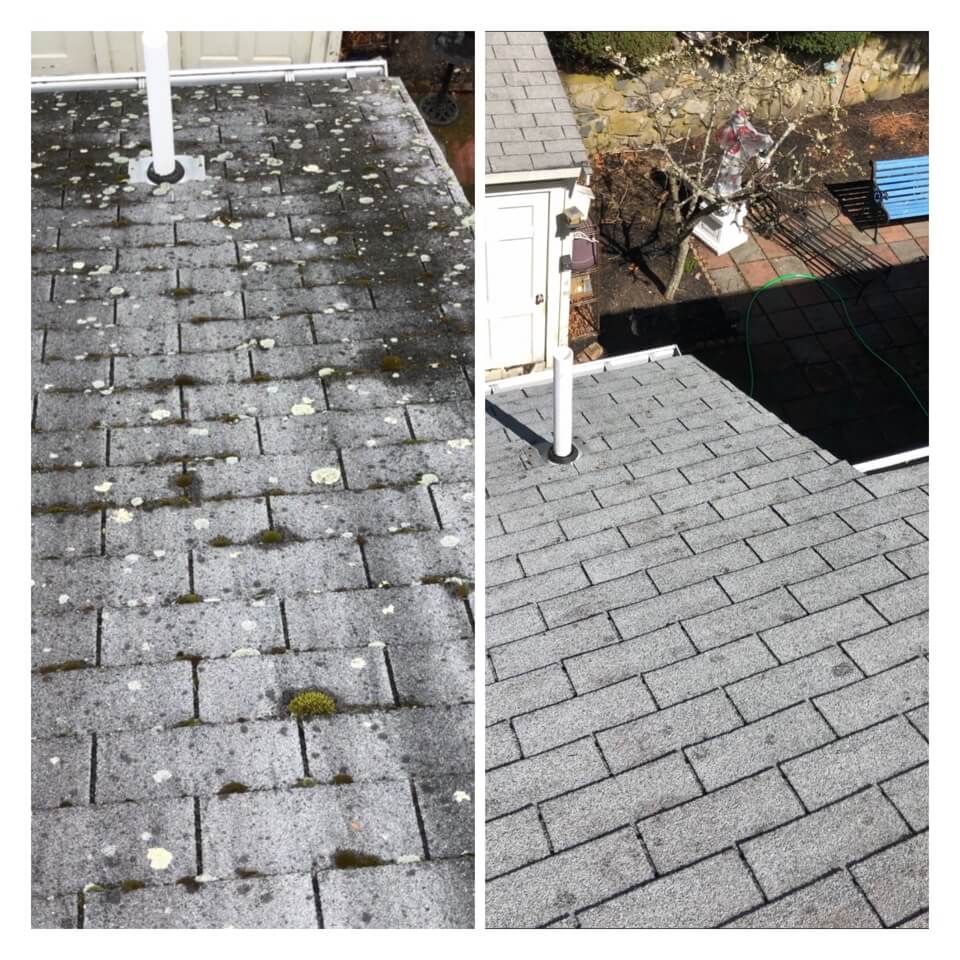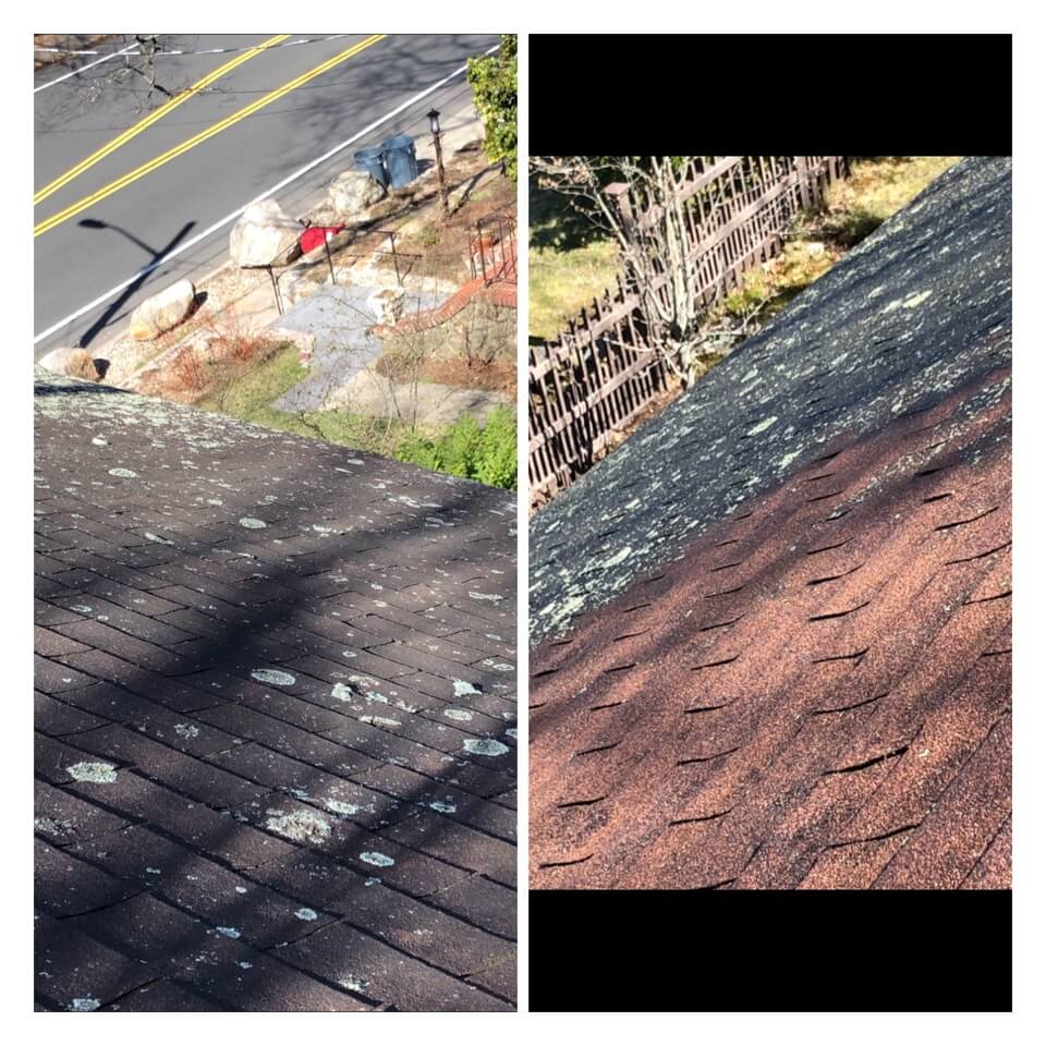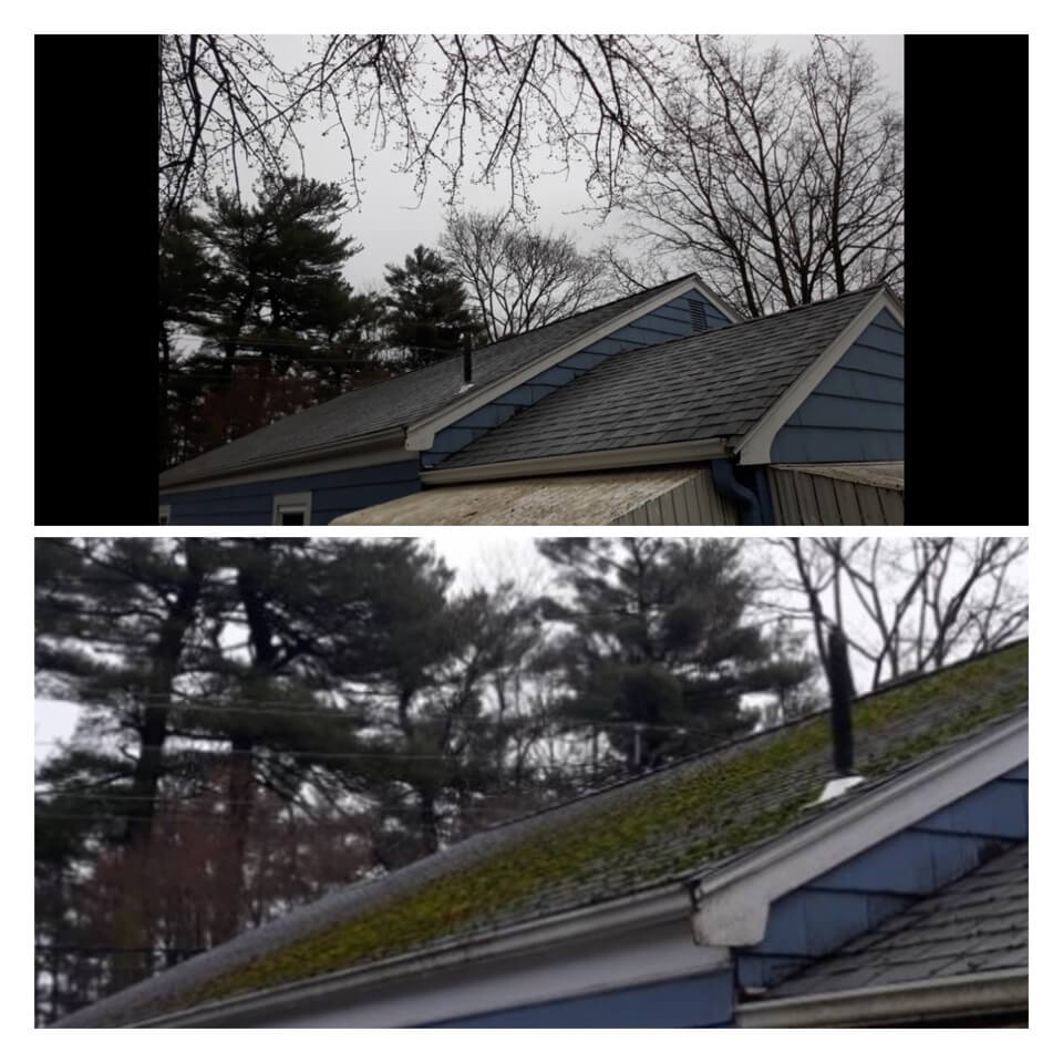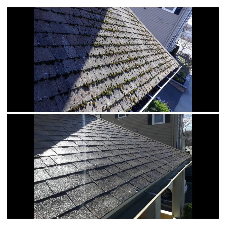 HiCleaners is the most experienced company in Weston, MA that deals with roof washing and roof soft washing. All of our employees are trained to recognize precise solution mixing ratios to provide you with the safest and most effective soft washing service. Roofs are a commonly neglected part of a house due to the fact that most people don’t have ladders to access it, so it is very easy to just leave it alone and forget about problems that may start to arise. Just like many home owners, discoloration and small bits of moss on a roof can be overlooked because of the misconception that it is just aesthetic. However, it isn’t just aesthetic, the moss slowly lifts the granules off the shingles which in turn shorten the life of the shingle. The moss also spreads, just like any bacteria if it is left alone for too long, it can quickly become a problem that spirals out of control. Call HiCleaners for a free quote, we only use the most advanced eco-friendly solutions and equipment to make sure the job is done right, for the safety of the employees, your plants, grass, pets, and children.